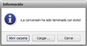 En cuanto la conversión esté terminada la siguiente ventana surgirá: