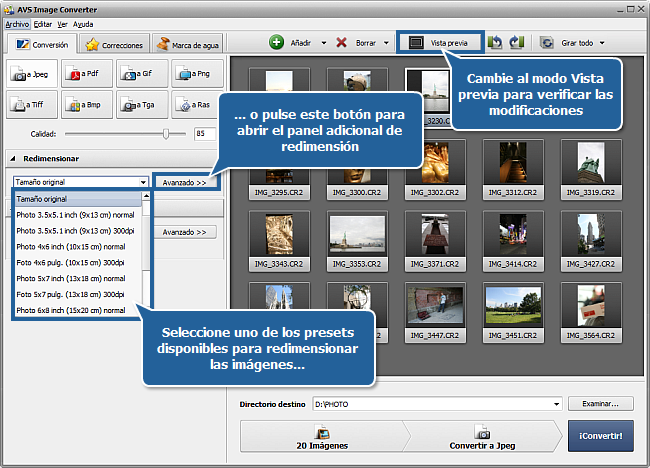 Para redimensionar las imágenes utilice uno de los presets disponibles en la lista desplegable en el apartado Redimensionar. Para verificar el resultado conseguido cambie al modo Vista previa pulsando el botón correspondiente en la Barra de herramientas.