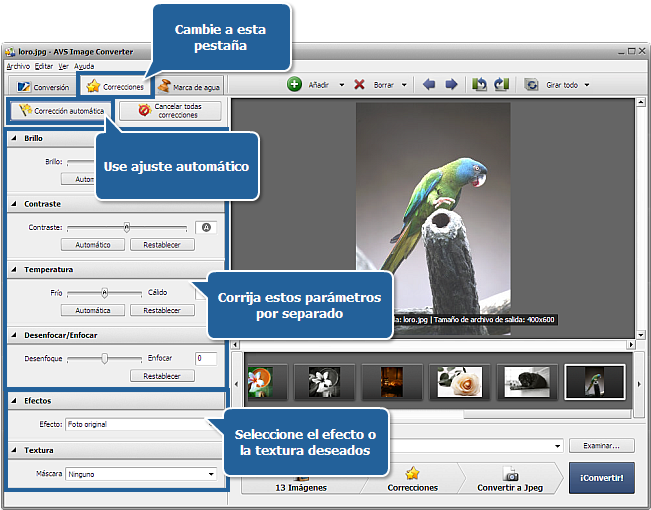 Después de redimensionar las imágenes puede hacer ajustes de corrección automática o aplicar efectos.