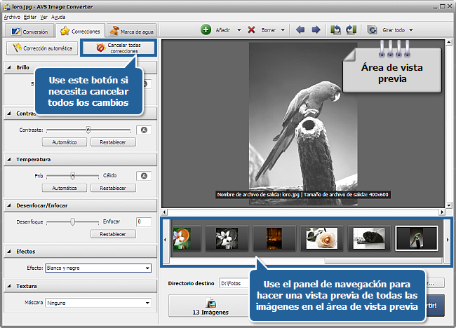 El efecto seleccionado será aplicado a todas las imágenes cargadas en el programa. Verifique los resultados en el área de Vista previa utilizando el Panel de navegación.
