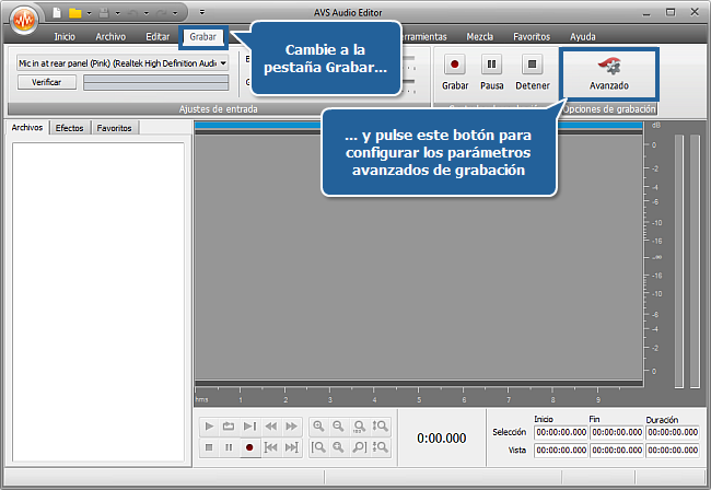 Aquí podrá configurar los ajustes de grabación de caracter general: seleccionar y verificar el dispositivo de entrada, ajustar su balance y volumen. Al pulsar el botón Avanzado del grupo Opciones de grabación tendrá la posibilidad de configurar los mismos parámetros más algunos ajustes de grabación adicionales.