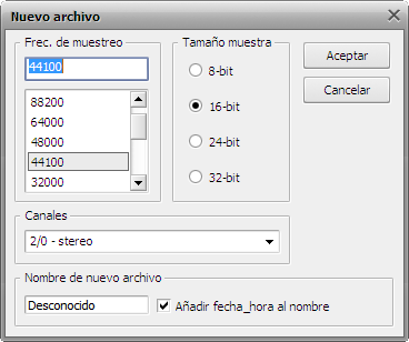 Surgirá la ventana que le permitirá configurar algunos parámetros del nuevo archivo con los datos de audio grabados. Estos parámetros son: