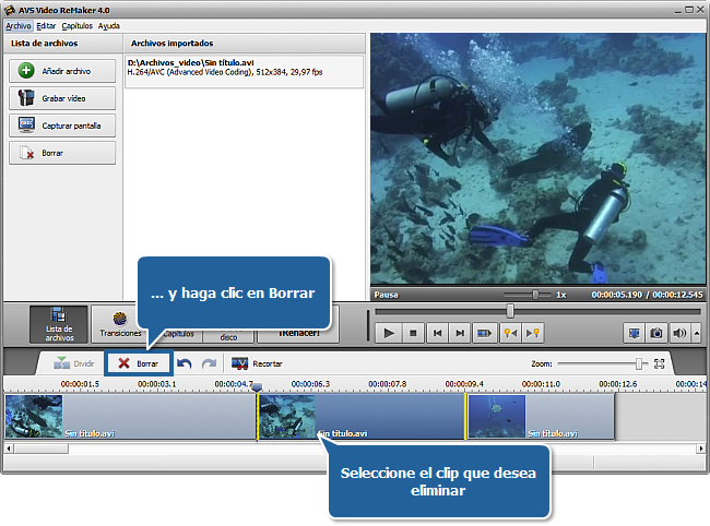 A veces puede encontrarse con la necesidad de dividir un archivo de vídeo en varios distintos sin editar ni pasarlo a otro formato. Con AVS Video ReMaker puede hacerlo de manera fácil y rápida. El programa le permitirá cortar un archivo de vídeo y borrar de él las partes no deseadas antes de guardar.