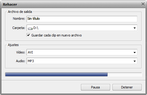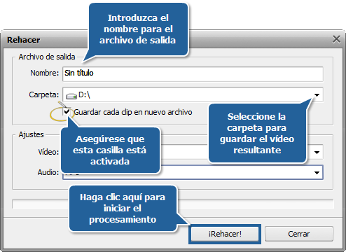En cuanto todo esté listo, pulse el botón ¡Rehacer! para emprezar a crear los nuevos archivos. Verá el progreso en la barra. El proceso llevará algún tiempo en función de la duración del archivo y configuración de su ordenador.