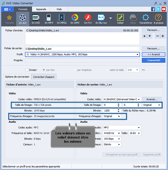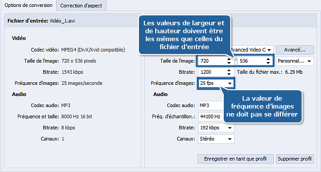 Si les valeurs correspondantes de la section du Fichier de sortie pour la Taille de l'image, la Fréquence d'images sont différentes de celles de la section du Fichier d'entrée, modifiez-les en sélectionnant les valeurs qui sont égales à celles du fichier d'entrée.