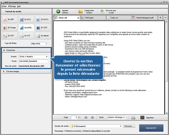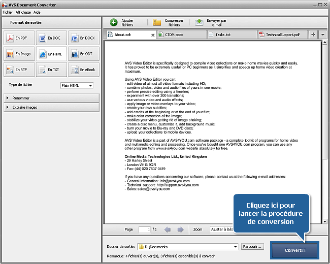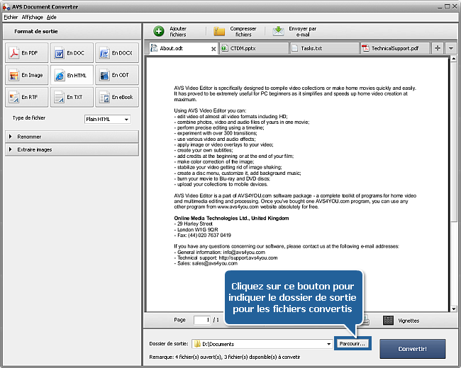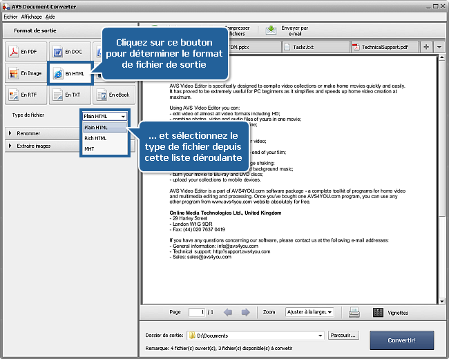 Parfois vous pouvez avoir besoin de convertir vos fichiers texte dans le format HTML pour les voir dans un navigateur Web ou les publier sur le Web. AVS Document Converter vous donne la possibilité d'enregistrer les documents comme les fichiers au format HTML ou MHT qui comprennent des graphiques et autres contenus intégrés dans l'archive Web unique.