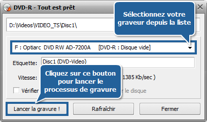 Vous pouvez sélectionner le graveur nécessaire si vous en avez plusieurs, rafraîchissez-le et cochez la case Vérifier le disque pour vous assurer de la qualité d'enregistrement du disque.