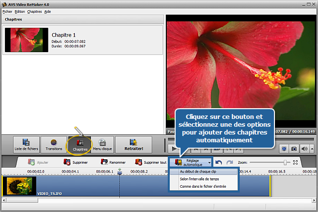 Vous pouvez aussi créer les chapitres automatiquement en cliquant sur le bouton Réglage automatique et en sélectionnant une des options disponibles: