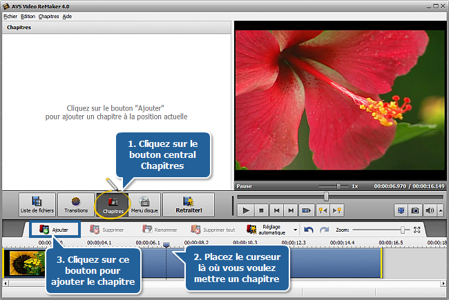 Pour créer un chapitre, cliquez à l'intérieur de l'Echelle de timeline là où vous souhaitez que le chapitre commence, puis cliquez sur le bouton Ajouter. De la même façon tous les autres chapitres sont créés.
