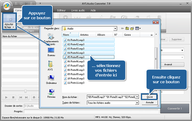 Pour charger un ou plusieurs fichiers audio dans le programme cliquez sur le bouton Ajouter fichier. Dans la fenêtre ouverte d'Explorateur Windows sélectionnez les fichiers nécessaires et appuyez sur le bouton Ouvrir.