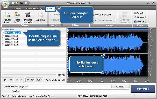 Vous pouvez traiter votre audio d'entrée avant de créer un livre audio s'il est nécessaire de supprimer quelques parties inutiles ou vous voulez appliquer l'effet Normaliser, par exemple.