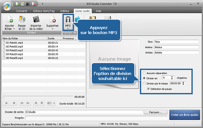 Sélectionnez le mode de division si vous voulez diviser votre livre audio en quelques chapitres. Vous pouvez choisir une de ces trois options:
