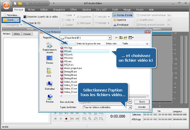 Pour sélectionner le fichier vidéo dont vous souhaitez modifier la bande son, cliquez sur le bouton Ouvrir dans l'onglet Principal. Dans la fenêtre Ouvrir fichier(s) sélectionnez l'option Tous les fichiers vidéo depuis la liste déroulante Types de fichiers et trouvez le fichier vidéo approprié: