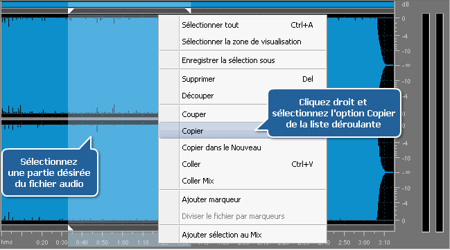 - sélectionnez avec la souris une partie du fichier audio que vous voulez copier dans votre vidéo, cliquez droit sur le morceau marqué et sélectionnez Copier depuis le menu contextuel;
