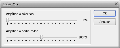 - dans la fenêtre ouverte réglez le volume sonore entre l'audio d'origine et la partie collée, validez avec OK. Amplifiez la partie collée à 100% et la sélection à 0% pour complètement couper le son d'origine.
