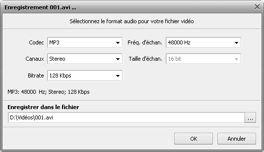 Spécifiez les paramètres de la piste audio de votre fichier vidéo. Puis indiquez le répertoire où vous souhaitez stocker le fichier obtenu, validez avec OK. Attendez jusqu'à ce que l'enregistrement soit fini.