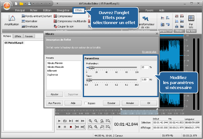 Cliquez sur le bouton d'effet pour lire la description de l'effet et modifier ses paramètres. Vous pouvez sélectionner un preset depuis la liste des presets disponibles ou définir les paramètres selon vos besoins. Utilisez le bouton Ecouter pour vérifier que les modifications sont bonnes. Pour comparer le fichier audio traité avec le son d'origine, cochez la case Bypass et cliquez sur Ecouter - vous entendrez le son sans effet. Cliquez sur le bouton OK pour les appliquer ou sur Annuler pour ne pas les prendre en compte et fermer la fenêtre de dialogue.