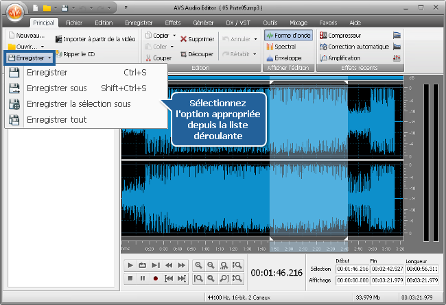 - Enregistrer tout pour enregistrer les changements dans tous les fichiers audio ouverts.
