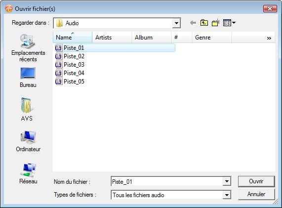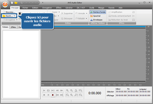 Pour ouvrir un fichier audio cliquez sur le bouton Ouvrir dans l'onglet Principal du Ruban de commandes.