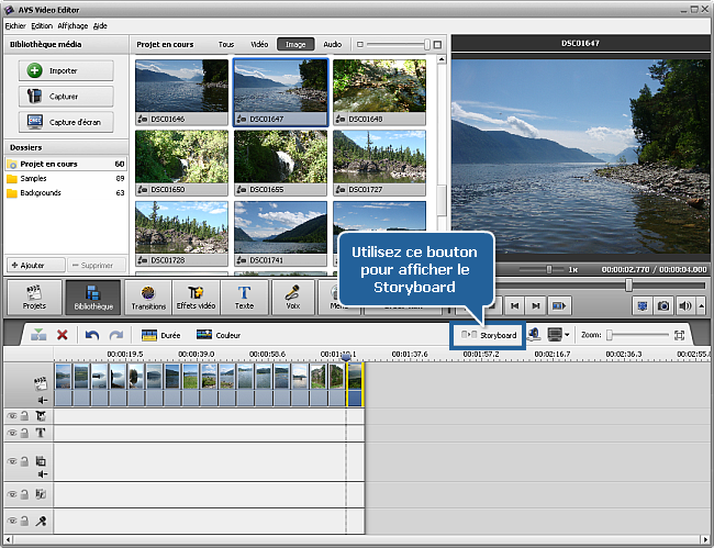 Premièrement, il faut importer votre collection de photos et des fichiers multimédias (par exemple, des clips vidéo ou une piste audio qui sera utilisée en tant que musique de fond) dans le programme et ajouter vos fichiers sur la zone Timeline/Storyboard. Puis suivez les étapes ci-dessous.