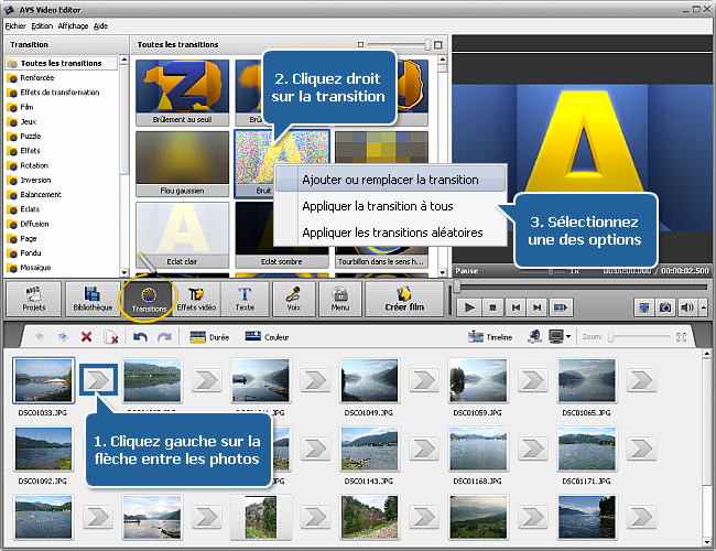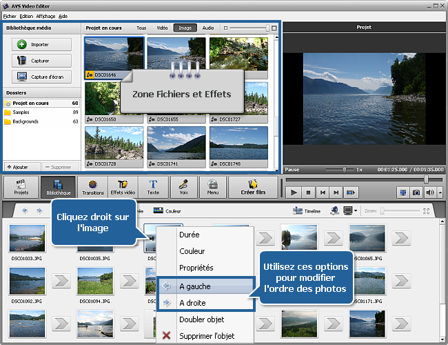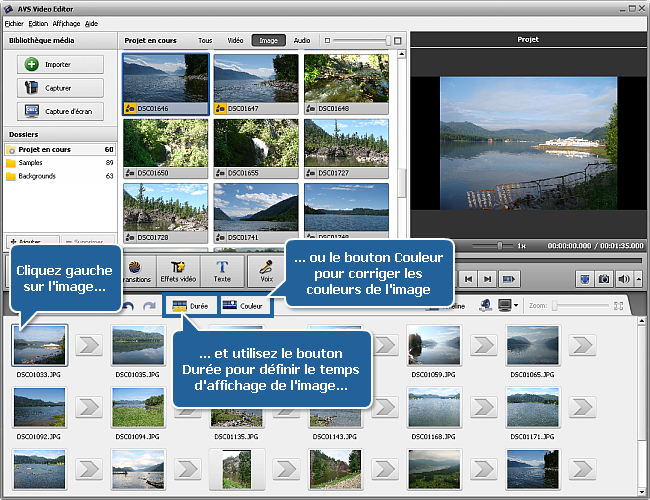Si vous avez besoin de réaliser une présentation à partir de vos photos numériques, utilisez notre AVS Video Editor qui vous permet de créer un diaporama avec des différentes transitions entre les images, vos propres sous-titres ou commentaires sonores, effets vidéo ou musique de fond.