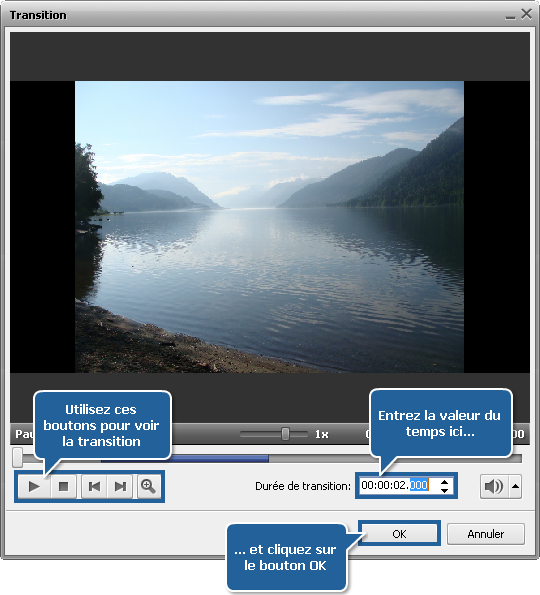 Définissez la durée des transitions en sélectionnant la transition nécessaire dans le Storyboard et en cliquant sur le bouton Transition sur la Barre d'outils Storyboard. Dans la fenêtre Transition ouverte, entrez la valeur appropriée dans le champ Durée de transition et validez avec OK. Vous pouvez également prévisualiser la transition sélectionnée dans cette fenêtre.