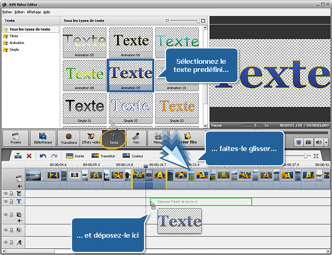 Cliquez sur le bouton Texte au milieu de la fenêtre principale. Sélectionnez un texte prédéfini depuis la zone Fichiers et Effets. Faites glisser le texte sélectionné et déposez-le sur la ligne d'effet textuel sur la Timeline.
