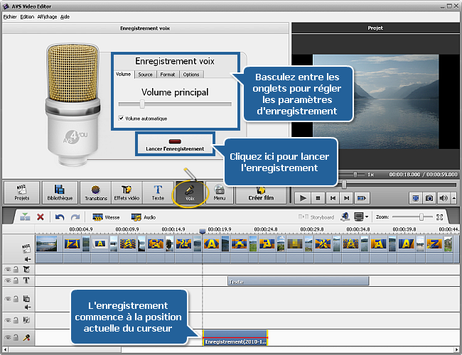 Si vous voulez ajouter des commentaires sonores à vos images, cliquez sur le bouton Voix au milieu de la fenêtre principale. Assurez-vous que le microphone est connecté à la carte son de votre ordinateur. Définissez les options d'enregistrement dans le panneau Enregistrement voix, placez le curseur à la position nécessaire sur la Timeline et cliquez sur le bouton Lancer l'enregistrement. Le bouton se transforme en bouton Arrêter l'enregistrement vous permettant de terminer la procédure d'enregistrement.