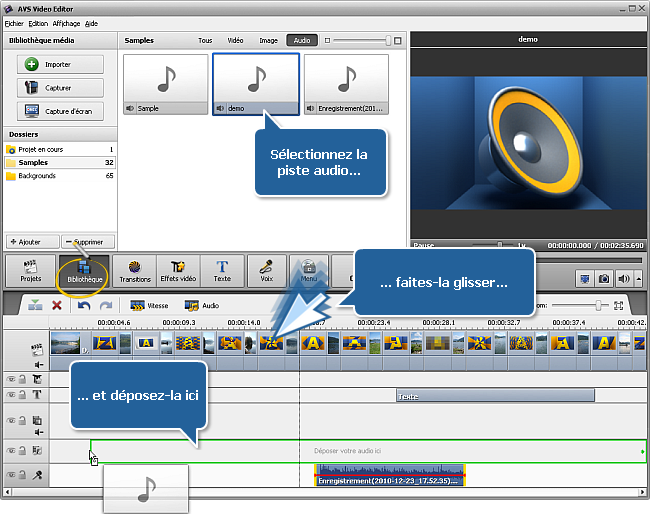 Pour ajouter une piste audio en tant que musique de fond, cliquez sur le bouton Bibliothèque et sélectionnez la catégorie Audio en haut de l'interface. Sélectionnez la piste audio précédemment importée dans la zone Fichiers et Effets et déposez-la vers la ligne d'audio mixé sur la Timeline.