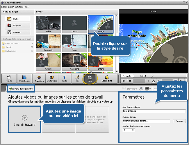 Si vous souhaitez réaliser votre diaporama au format DVD ou Blu-ray, vous pouvez créer un menu de disque. Cliquez sur le bouton Menu au milieu de la fenêtre principale. Assurez-vous que la case Menu du disque activé est cochée. Double cliquez sur un style de menu prédéfini dans la zone Fichiers et Effets pour l'appliquer à votre diaporama.