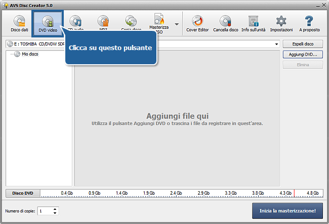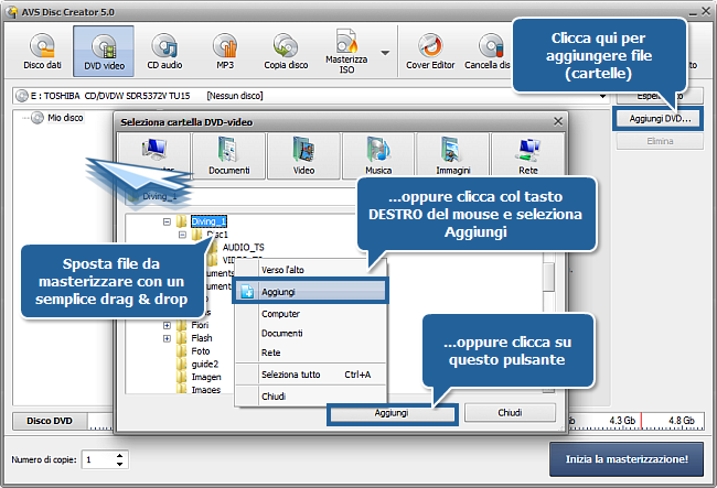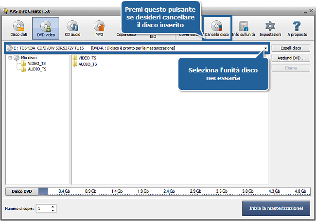 Per masterizzare una cartella DVD utilizza AVS Disc Creator. L'interfaccia del programma è molto semplice. Ti sarà sufficiente selezionare l'unità disco di uscita, aggiungere file e cartelle, cancellare il disco se non è vuoto e finalmente cliccare su Inizia la masterizzazione!.