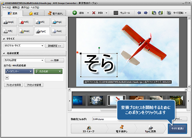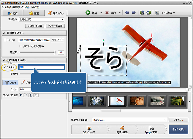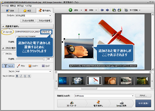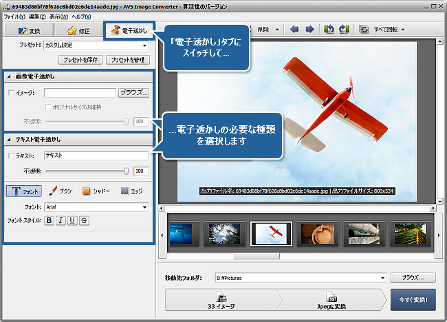 ウェブサイトに公開された写真を保護することがほしいですか。または、写真がいつどこで撮られたことについての情報があるキャプションをアルバムの写真に追加する必要がありますか。AVS Image Converter を使用して、そのタスクを間単に実行できます。プログラムによって一組の画像に可視的なテキストもしくは電子透かしを適用して、その画像をサポートされている形式の一つに変換できます。
