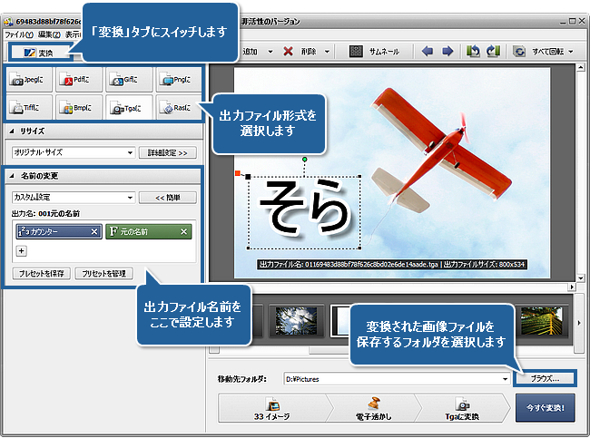 出力画像形式を選択するために、変換タブにスイッチして、該当するボタンをクリックします。