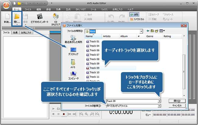 音を大きくする必要がある音声ファイル(それの一部)を選択するために、ホームタブにある開く...ボタンをクリックします。開けたファイルを開くウインドウでファイルの種類フィールドですべてのオーディオファイルを選択されたことを確認して、必要な音声ファイルを参照します: