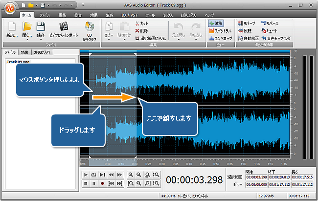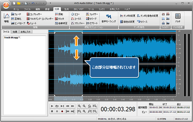オーディオトラックの一部の音量を増加する必要がある場合、波形表示でその一部をマウスでマーカーして、選択された断片がハイライトされます: