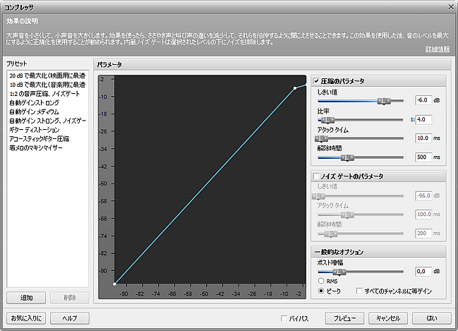 ポスト増幅は、コンプレッサが適用されたあとで、音がどのくらいの量で増幅されるか定義します。音声を圧縮したレベルと同じにそれを増幅することがお勧めします。