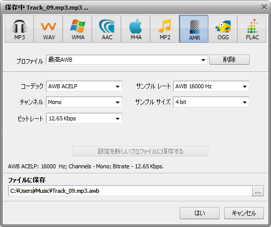 音声ファイルのパラメーターを設定します。そして、ファイルに保存フィールドに結果の音声ファイルの位置を選択して、はいをクリックします。プログラムがファイルを保存している間にしばらくお待ちください。