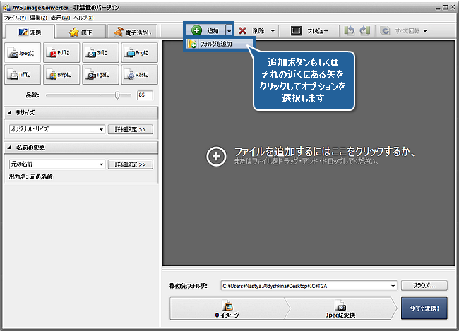 コンピュータのHDDに保存されている画像があるフォルダをロードするために、 追加ボタンの隣の黒い矢をクリックして、フォルダの追加オプションを選択します。