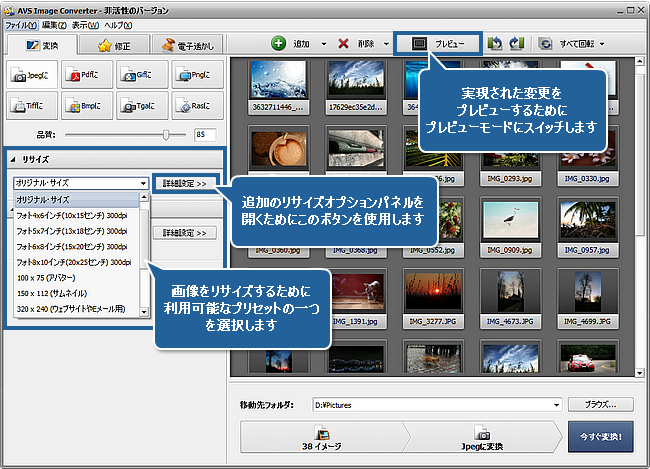 画像のサイズを変更するために、リサイズパネルプリセットドロップダウンリストから利用可能なプリセットの一つを使用します。達成された効果を見るために、ツールバーの対応するボタンをクリックして、プレビューモードにスイッチします。