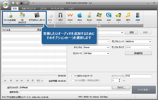 ファイルの追加をクリックして、コンピュータのハードドライブにあるオーディオトラックをプログラムにロードできます。ファイルの追加ボタンの下にある矢をクリックして、フォルダが含むすべての音声ファイルをプログラムに追加するにはフォルダの追加を選択します。または、サブフォルダを含むフォルダから音声ファイルをロードして、それの構造を保存するために、フォルダ構造を保存して、ファイルを選択するオプションを選択します;