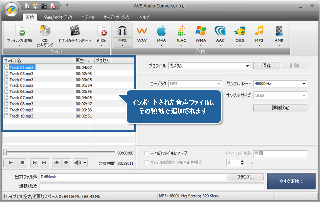 どんな場合でも、インポートされた音声は AVS Audio Converter のメインウインドウに表示されます: