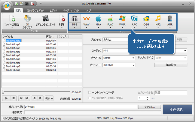 AVS Audio Converter のメインウインドウの上のコマンドバーにある対応するボタンをクリックして、出力音声形式を選択します: