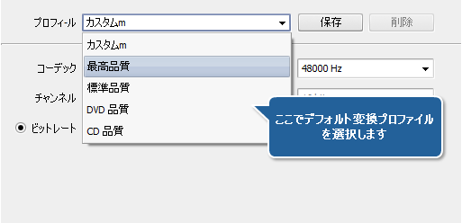 プロファイルフィールドのドロップダウンリストでデフォルトの変換プロファイルの一つを選択します。プロファイルは特定の目的のためにあらかじめ作られたパラメータの設定ということです。例えば、一定の品質があるファイルを作成し、特別のデバイスでファイルを再生することがあります。初めてオーディオ変換をする場合、デフォルトプロファイルを使用することをお勧めます。