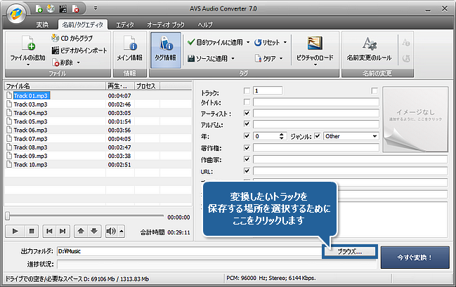 注: タグは音声ファイルのトラックの名前と番号、作者、リリース日などのような内蔵のテキスト情報です。オーディオファイルを再生するとき、多くのオーディオプレイヤーがファイル名やタグを使用するので、タグフィールドを記入するのは役に立つことがあります。