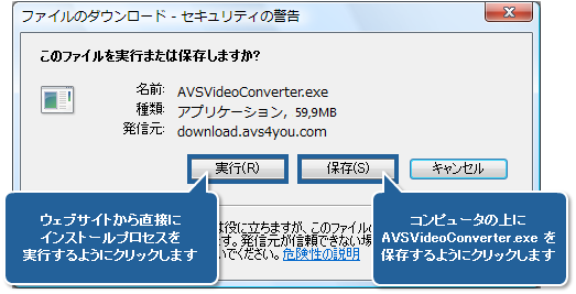 AVSVideoConverter.exe ファイルを PC の上に保存するように、開いたウインドウで保存をクリックするか、またはインストールプロセスをウェブサイトから直接に実行するように実行を選択します。保存ボタンをクリックした後、新しいウインドウが開かれます。installation.exeファイルを保存しておきたいディレクトリを選択することを提供されます。任意の一つを選択して、OK をクリックします。 ダウンロードが完了するまで待ちます。