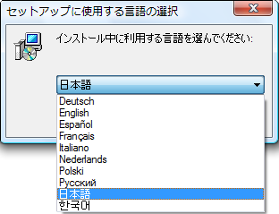 インタフェースのための言葉を選択します。10の言葉が使用可能です:日本語、ドイツ語、英語、スペイン語、フランス語、イタリア語、オランダ語、ポーランド語、韓国語。必要な言葉を選択して、OK をクリックします。