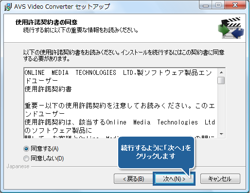 使用許諾契約書のページを読んで、契約書の条件に同意するなら、同意するオプションをチェックして、インストールを続行するように次にをクリックします。