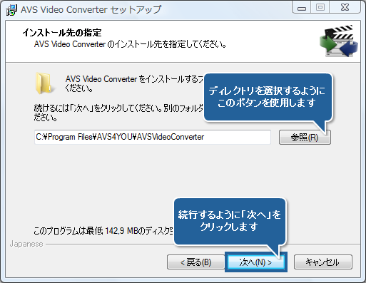 プログラムをインストールしたいディレクトリを選択します。デフォルト位置はローカルディスクC:\Program Files\AVS4YOU\AVSVideoConverter です。