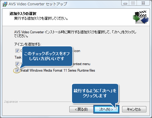 WMV ファイルとの正しい作業のために Windows Media Format 11 Series Runtime ファイルのインストールオプションをチェックされて残します。