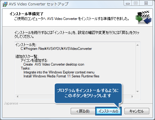 インストールパラメータの設定を見直して、満足する場合には、AVS Video Converter をお使いのPC の上にインストールするようにインストールをクリックします。